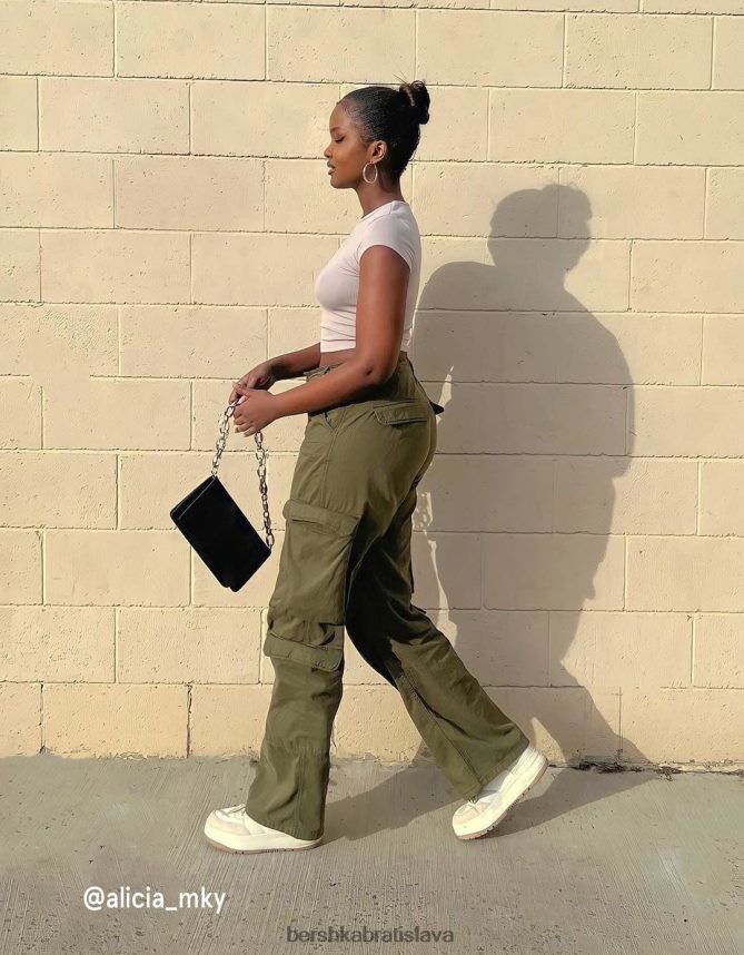 Bershka unisex nastaviteľné viacvreckové keprové cargo nohavice kaki oblečenie B86RXX3878 Bershka Rifle