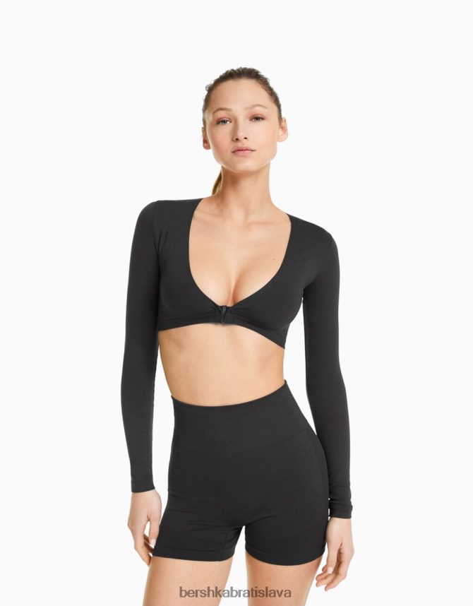 Bershka ženy Bezšvové skrátené tričko s dlhým rukávom a výstrihom do V tmavo šedá oblečenie B86RXX372 Bershka Nohavice
