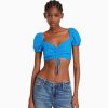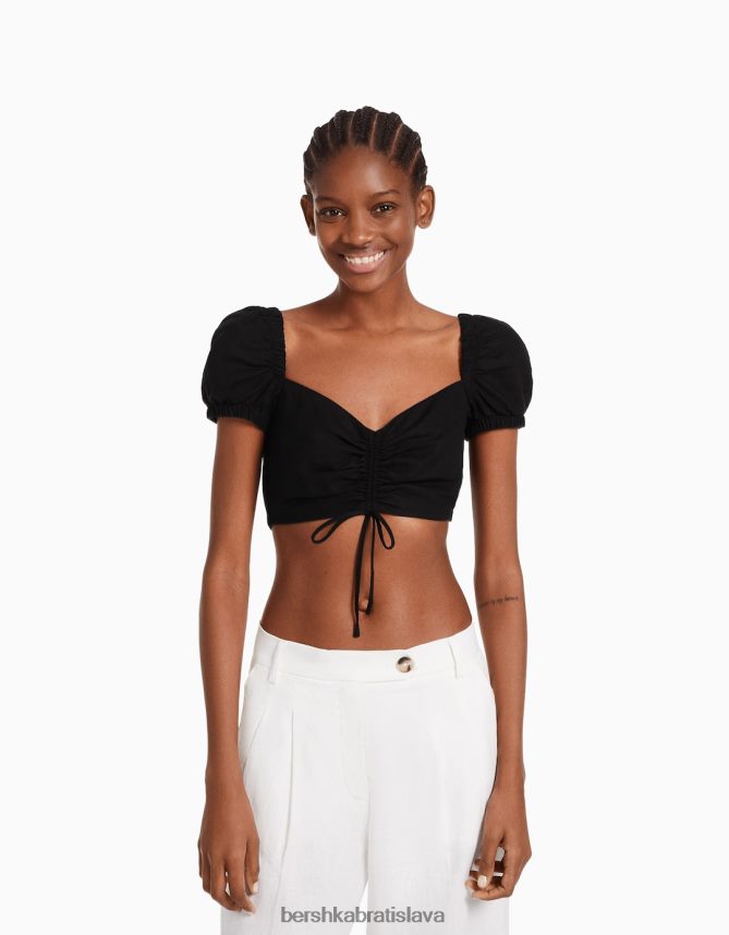 Bershka ženy crop top s krátkym rukávom z ľanovej zmesi s naberanými detailmi čierna oblečenie B86RXX774 Bershka Nohavice