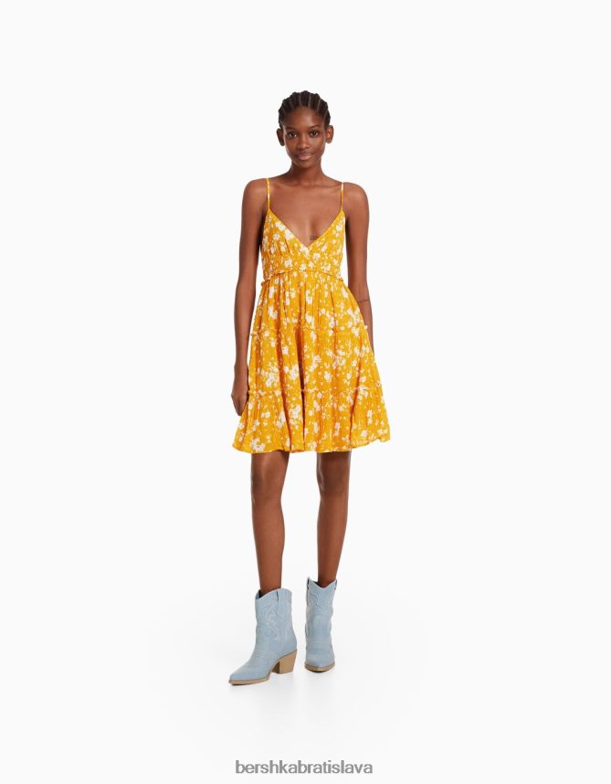Bershka ženy mini šaty s volánovými ramienkami horčica oblečenie B86RXX160 Bershka Slovakia