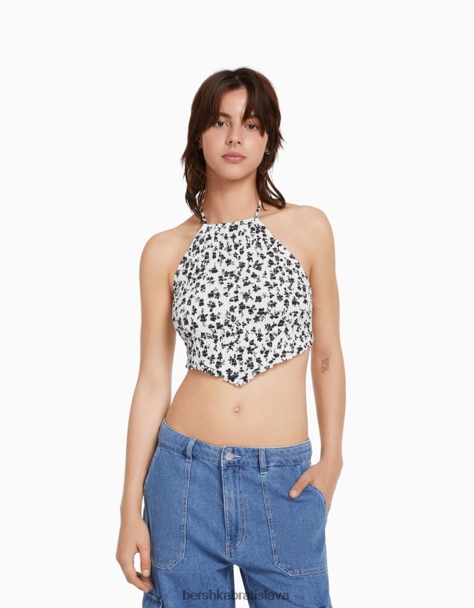 Bershka ženy Ohlávkový top s detailom zaväzovania a riasenou gumou biela/čierna oblečenie B86RXX890 Bershka Rifle