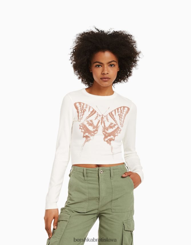 Bershka ženy tričko s dlhým rukávom s potlačou krém oblečenie B86RXX616 Bershka Slovakia
