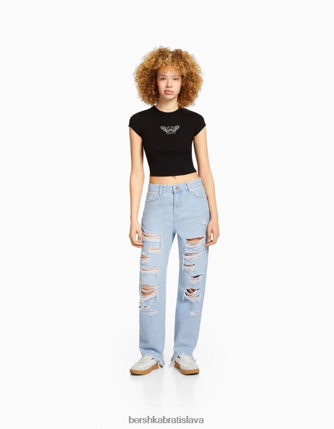 Bershka unisex roztrhané skrátené džínsy s rovnými nohavicami svetlo modrá oblečenie B86RXX3962 Bershka Rifle