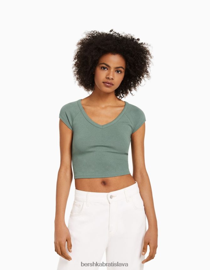 Bershka unisex vypasované tričko s krátkym raglánovým rukávom s výstrihom do V kaki oblečenie B86RXX3814 Bershka Slovakia