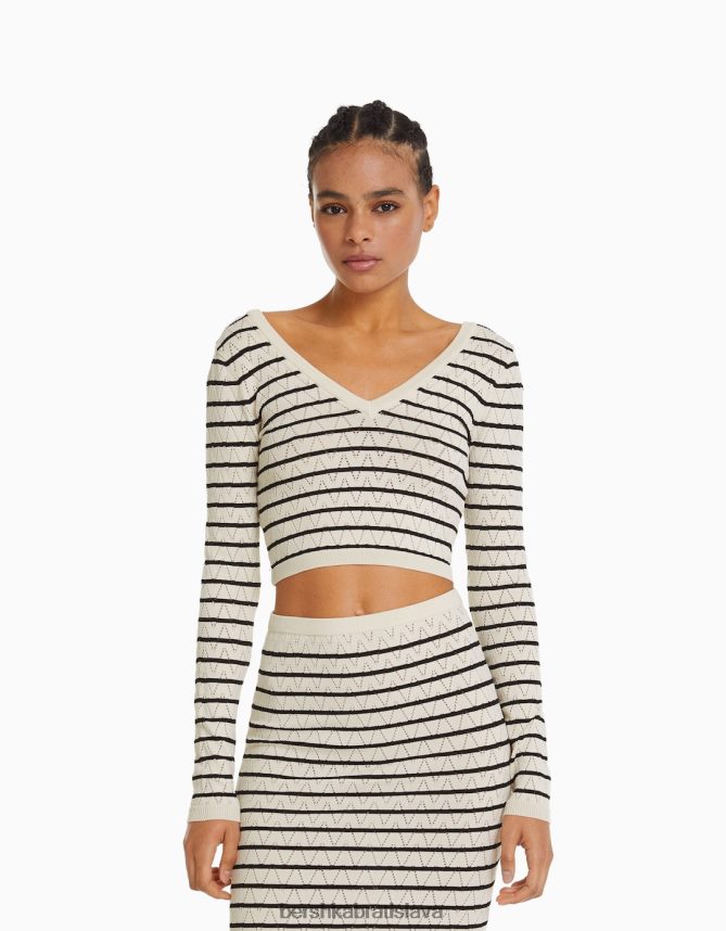 Bershka ženy pruhovaný otvorený úpletový sveter s výstrihom do V krém oblečenie B86RXX989 Bershka Rifle