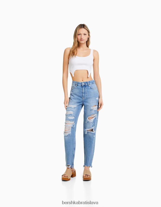 Bershka ženy roztrhané skrátené rovné nohavice mama džínsy svetlo modrá oblečenie B86RXX1571 Bershka Rifle